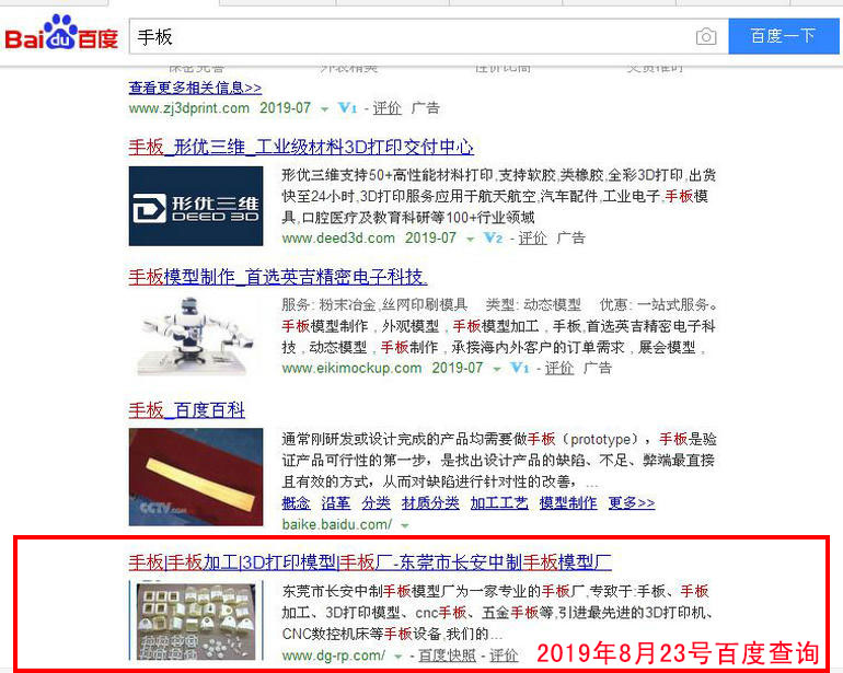 手板廠 : 2019-02-28上線    2019-03-05百度第22(原為第4頁 第6位)    2019-03-13百度第5名    2019-03-19百度第3名    2019-03-25百度第1名
